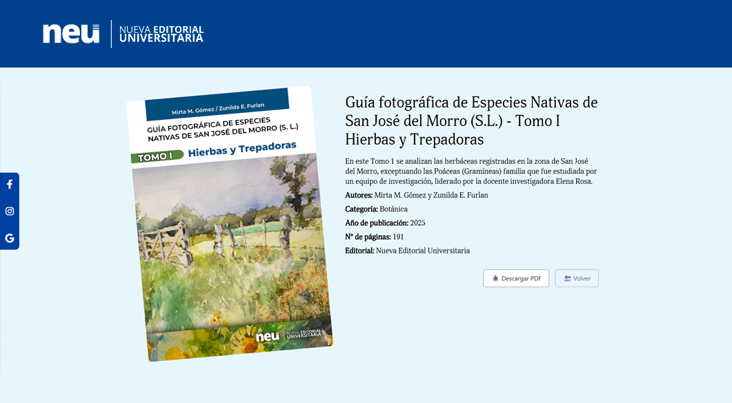 El Proyecto de Investigación “Uso de herramientas biotecnológicas para la caracterización y desarrollo de germoplasma nativo con potencial ornamental, aromático y medicinal de San Luis” (FICA-UNSL) tiene el agrado de comunicar que se encuentra disponible, en el sitio web de la Nueva Editorial Universitaria de la UNSL, el libro “Guía fotográfica de especies nativas de San José del Morro (S.L.)”.