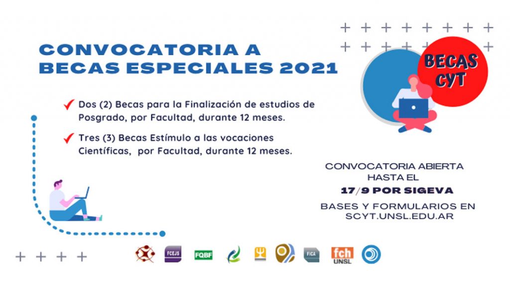 La Secretaría de Ciencia y Tecnología de la UNSL informa que, hasta el 17 de septiembre 2021, se encuentra abierta la convocatoria a Becas Especiales…