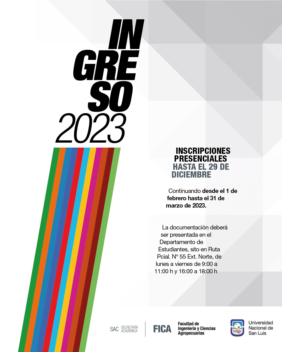 La Secretaría Académica informa que desde el 5 de diciembre y hasta el 29 de diciembre de 2022, y desde el 1 de febrero hasta el 31 de marzo de 2023, permanecerá abierta la instancia de inscripciones para todas las carreras de FICA.
