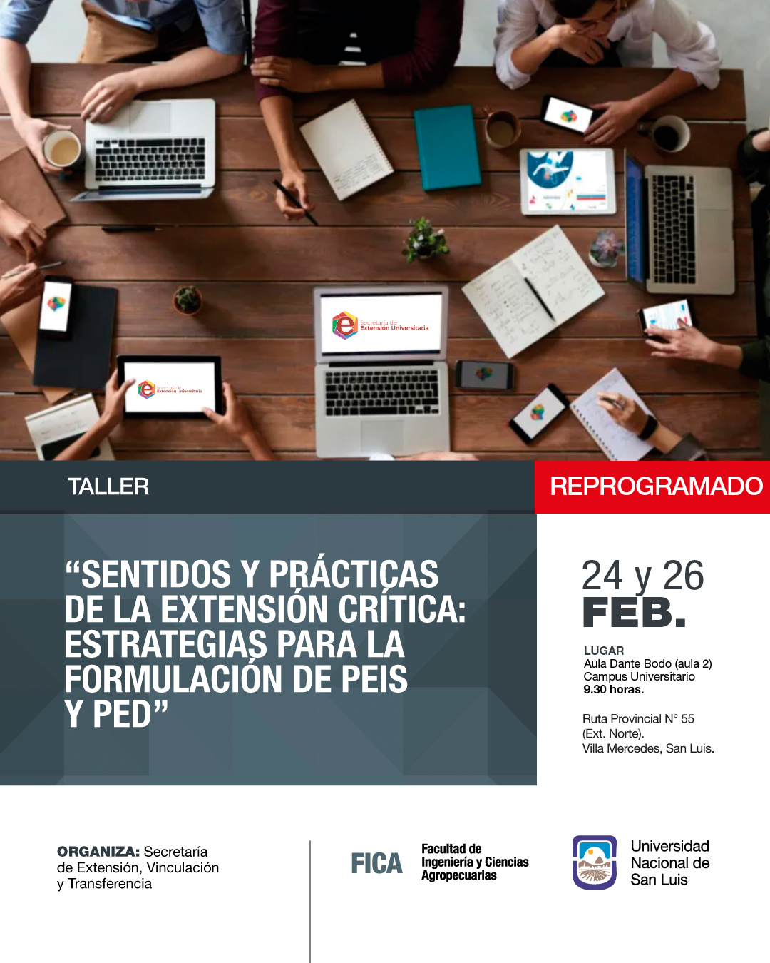 La Secretaría de Extensión, Vinculación y Transferencia informa que el dictado del taller “Sentidos y prácticas de la Extensión Crítica: estrategias para la formulación de PEIS y PED”, ha sido reprogramado para el martes 24 y jueves 26 de febrero de 2026. Esta actividad se desarrollará en el Aula Dante Bodo (aula 2) de 9.30 a 12 horas.