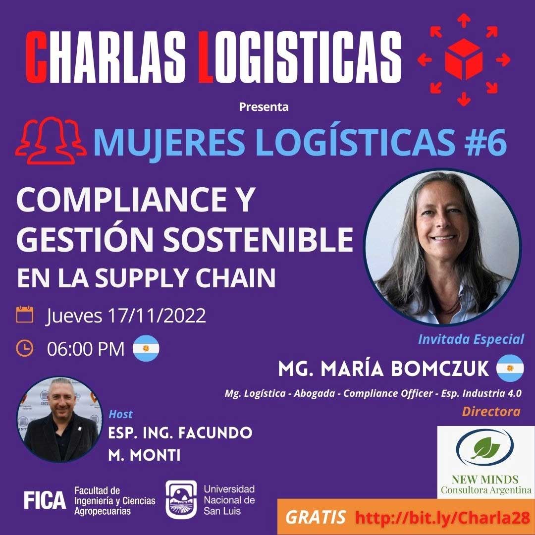 En esta ocasión, expondrá la Mgtr. María Bomczuk sobre “Compliance y Gestión Sostenible en la Supply Chain”. Bomczuk es Directora de “NewMinds Consultora” e integrante Red FLOR. Es Abogada con un Máster en Logística, certificación Internacional en Ética y Compliance Gestión de Riesgos y Estrategias para el Desarrollo Sostenible
