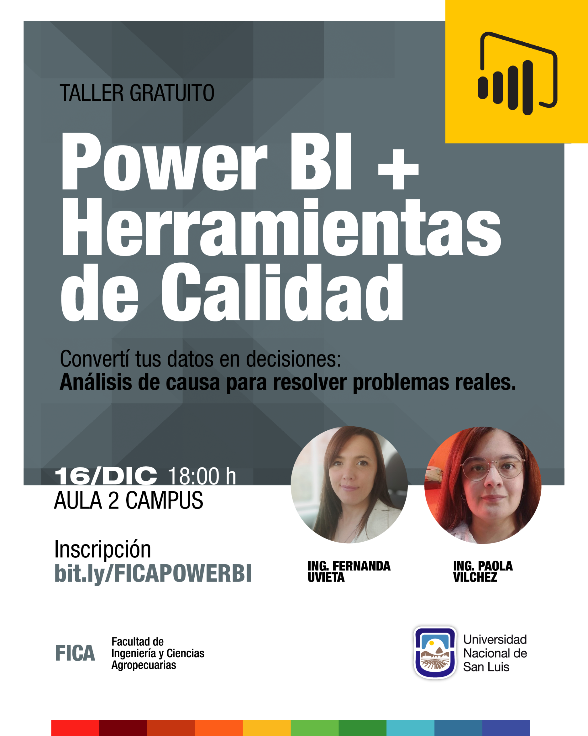 La Secretaría de Extensión, Vinculación y Transferencia invita al taller gratuito “Power BI + Herramientas de Calidad”, que se llevará a cabo el 16 de diciembre a partir de las 18 horas, en el Aula Dante Bodo (Aula 2) del Campus Universitario.