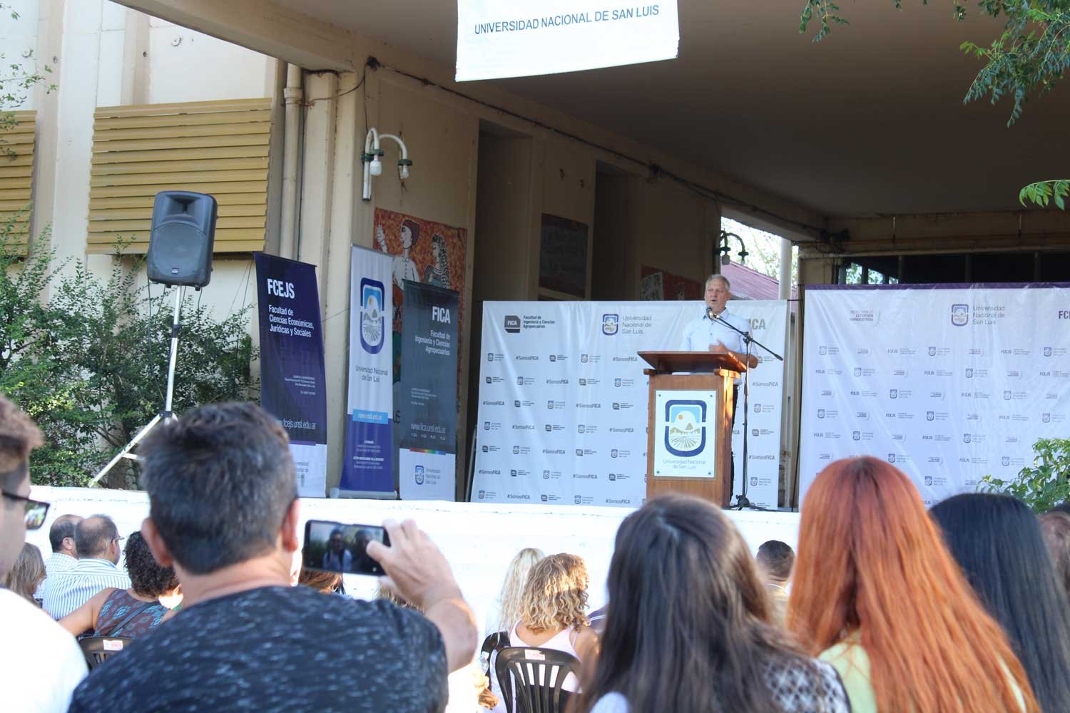 Finalizado ambos discursos, la bienvenida prosiguió con las palabras del Decano de la FICA, Mgtr. Sergio Ribotta, quien puntualizó que la UNSL tiene dos actos fundamentales, “uno es el de ingreso, en el que están participando ustedes, y otro es el acto de egreso cuando finalizan sus estudios. Por eso es muy significativo estar compartiendo este momento con todos ustedes”. Destacó que la institución transitará un año importante, ya que celebrará en mayo sus 50 aniversario, “una fecha importante para una universidad que es un referente en la provincia por su prestigio”.