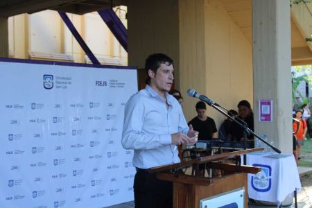 El acto continuó con las palabras del Subsecretario de la Secretaría de Asuntos Estudiantiles y Bienestar Universitario (SAEBU), Ing. Matías Funes. Expresó que UNSL, a través de la SAEBU, brinda diferentes beneficios a todos los estudiantes y lleva adelante actividades recreativas que permiten la inserción del estudiante a la comunidad universitaria de Villa Mercedes.